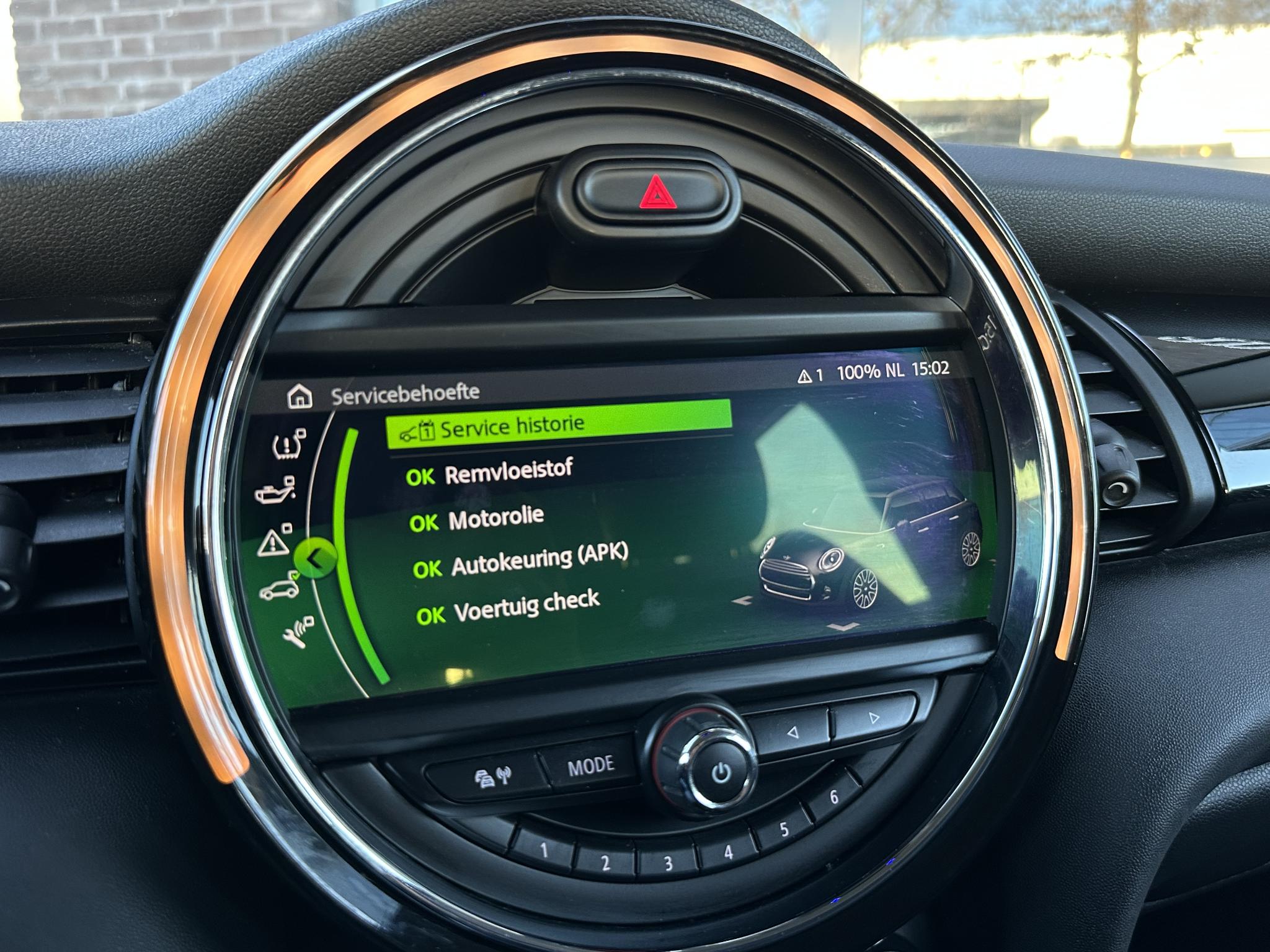 Multifunctie voor Stuur 249 Lichtmetalen velgen 7x18 (Cone Spoke,Zilver) 2E Dak wit gespoten Buitenspiegel wit 382 Vloermatten Velours 423 Binnenspiegel met Dimautomaat 431 Rokerpakket 441 Stoel voor rechts hoogte verstelbaar 450 Armleuning voor 473 Opbergruimte-pakket Laadruimtevloer variabel Aansluiting (12V-aansluiting) extra 493 Stoelverwarming voor 494 Interieurinrichting: Interieur-oppervlak Piano Black 4BD Excitement-pakket 4V9 MINI Driving Modes 4VA Park-Distance-Control (PDC) voor en achter 508 Automatische airconditioning 2 zones met autom. luchtcirculatiefunctie 534 Cruisecontrolsysteem (Cruisecontrol) met Remfunctie (DCC) 544 Licht-pakket - Ambienteverlichting - Leeslampen voor563 - Mistlamp LED 5A1 - Koplamp LED 5A2 Rijassistent-systeem Parkeerhulp 5DP Audio-navigatiesysteem 6UM Uitrustingspakket: Connected Navigation Plus Telefonie met Wireless Charging MINI Connected XL (Interface) Stuur (Sport/leder) 7GK Uitrustingspakket: Chili 7Y2 Metallic-lak A62M Stoelbekleding/kussens: Leer Cross Punch Sportstoelen voor Lendensteun Stoel voor links en rechts NEE1