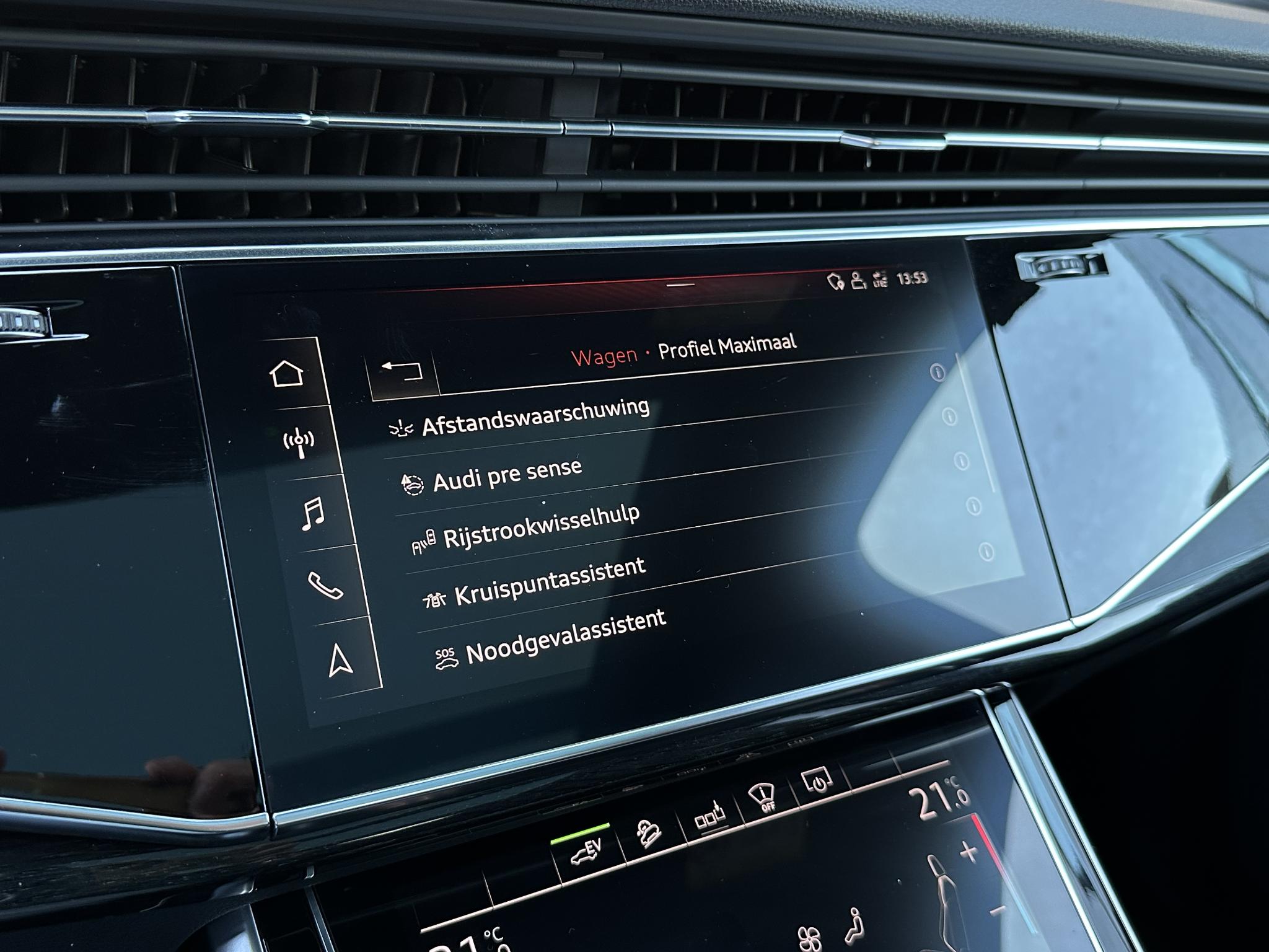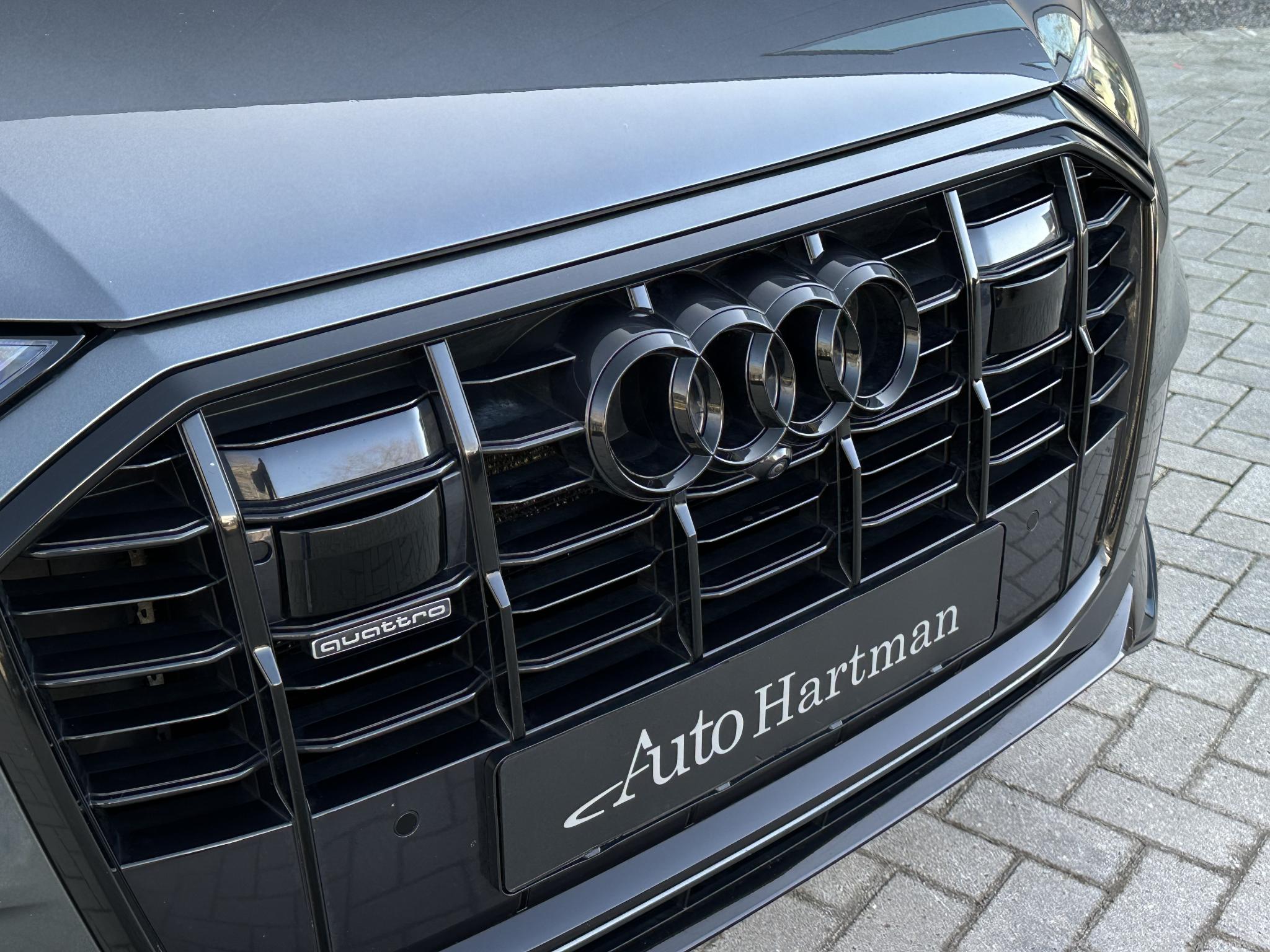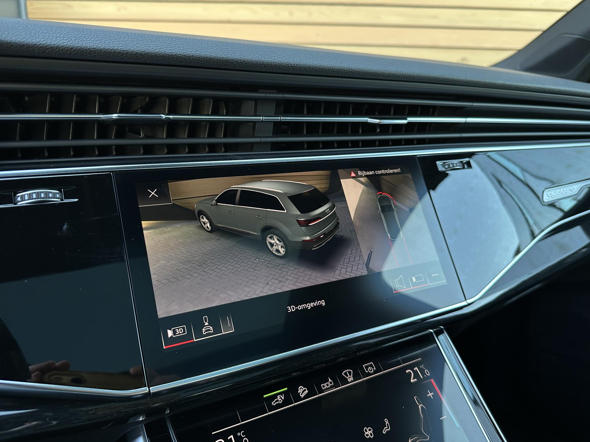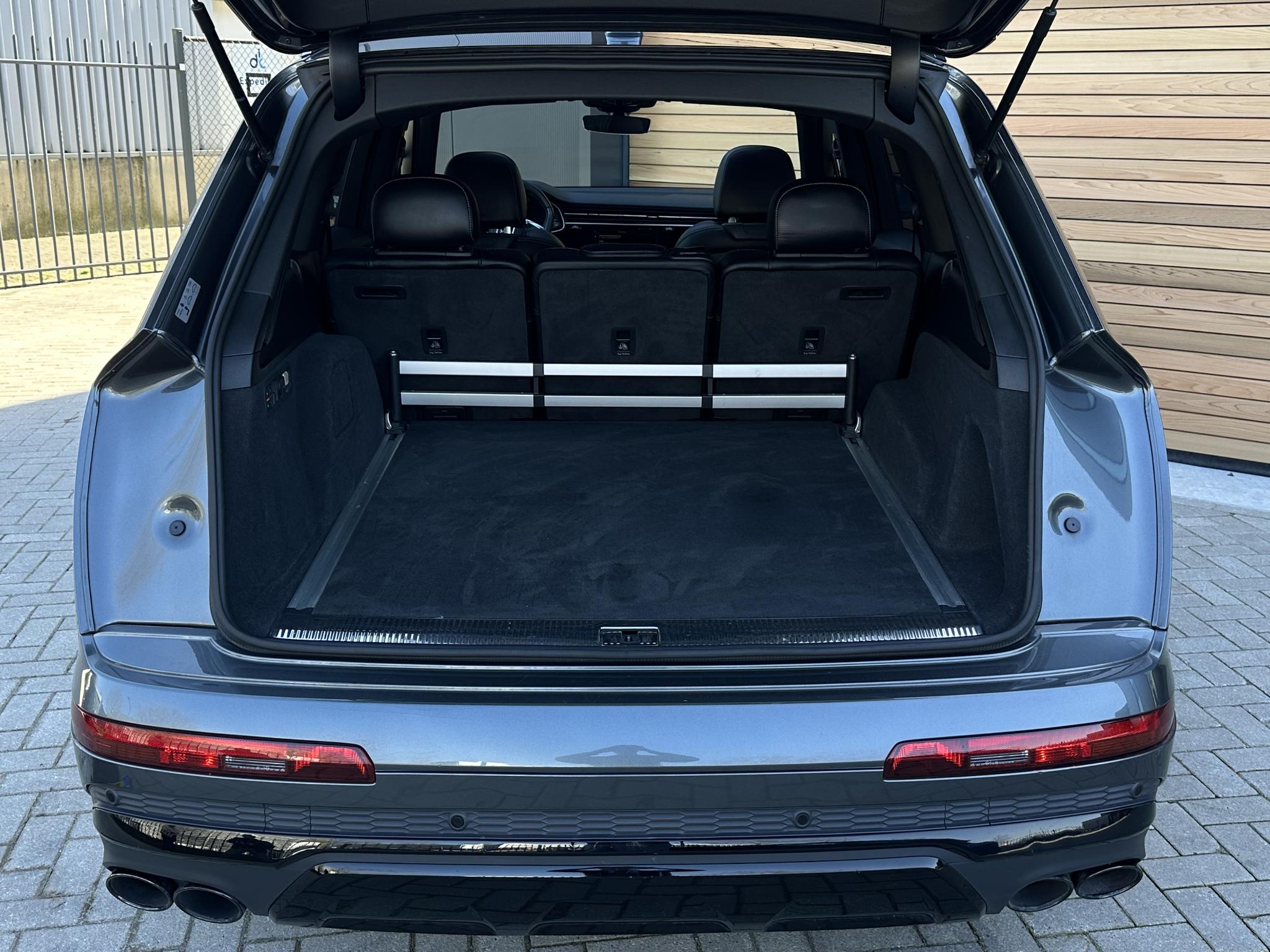 Chassis (adaptive air suspension) 1BK Trekhaak (kogelkop elektrisch zwenkbaar) 1D3 Diefstalbeveiliging voor Wielen (Velgsloten) 1PR Sperdifferentieel 1Y6 Stuurkolom (Stuur) electr. verstelbaar 2C7 Stuur (Sport/leder - 3-spaaks, afgeplat aande onderzijde) met Multifunctie en Schakelfunctie 2PF Panoramadak voor elektrisch, achter vast 3FU Isofix-houder voor Kinderzitje aan Passagiersstoel 3G4 Bevestigingsset voor Railsysteem in Bagageruimte 3GN Stoelen voor electr. verstelbaar (links metMemory) 3L4 Stoelverwarming voor en achter 4A4 Sluit-/startsysteem Advanced Key (Comfortsleutel) Bagage-/laadruimteafdekking elektrisch Laadrandbescherming (Roestvrij staal) Diefstalalarmsysteem +Interieurbeveiliging / Sleepbeveiliging 4I3 Zij-airbag achter 4X4 Achterbank (2. Serie) verschuifbaar (plus) 5KA Hoofdsteunen variabel verstelbaar 5ZC Middenarmsteun voor Comfort-uitrusting 6E6 Buitenspiegel electr. verstelbaar, verwarmbaar en inklapbaar, met Dimautomaat en Memory Buitenspiegel met Stoeprandfunctie, rechts6XL Parelmoereffect-lak 6Y6Y Bandenspanningscontrolesysteem 7K3 Interieurinrichting: Decordelen Hout Eikgrijs 7TM Sound-systeem BOSE 9VS Rear Seat Entertainment RSE (Voorbereiding) 9WQ Bluetooth-handsfree-installatie metS praakherkenning (Audi Phone Box) 9ZE Lichtmetalen velgen 9x20 (5-parallelspaaksdesign) F08 Audi Smartphone Interface IU1 Head-up-display KS1 Hulppakket Tour PCC Hulppakket Stad - Rijassistent-systeem 360 graden rondombescherming (Audi pre sense360°) - Rijassistent-systeem Kruising-assistent - Rijassistent-systeem Uitstap waarschuwing - Rijassistent-systeem Dwarsverkeer assistent Achterkant - Rijassistent-systeem Rijstrookwisselassistent (Side Assist) incl. Audi presense rear PCM Comfort-sleutel met sensorgestuurde Achterklepontgrendeling incl. (openen +sluiten) Laadrandbescherming (Roestvrij staal) Bagage-/laadruimteafdekking elektrisch PGC Matrix-LED-koplamp met Laserverlichting PXB Beglazing achter verduisterd (Privacybeglazing) QL5 Kontur / Ambienteverlichtings-pakket (plus) QQ2 Radio-ontvangst digitaal (DAB) QV3 Audi music interface op de achterbank UF8 Akoestisch glas Portierruiten aan de zijkant VW0 Uitrustingspakket: S line Sport / Plus instaplijsten met Aluminiuminzetstuk en Handtekening, verlicht Laadrandbescherming (Roestvrij staal) Interieurinrichting: Decordelen Aluminium Mat Dakbekleding Stof, zwart Vloermatten Audi exclusive Sportstoelen voor Stoelen voor electr. verstelbaar Lendensteun voor, electr. verstelbaar Schakel-/selectie hefboomgreep Leer (geperforeerd) Stuur (Sport/leder - 3-spaaks) met Multifunctie en Schakelfunctie WQS