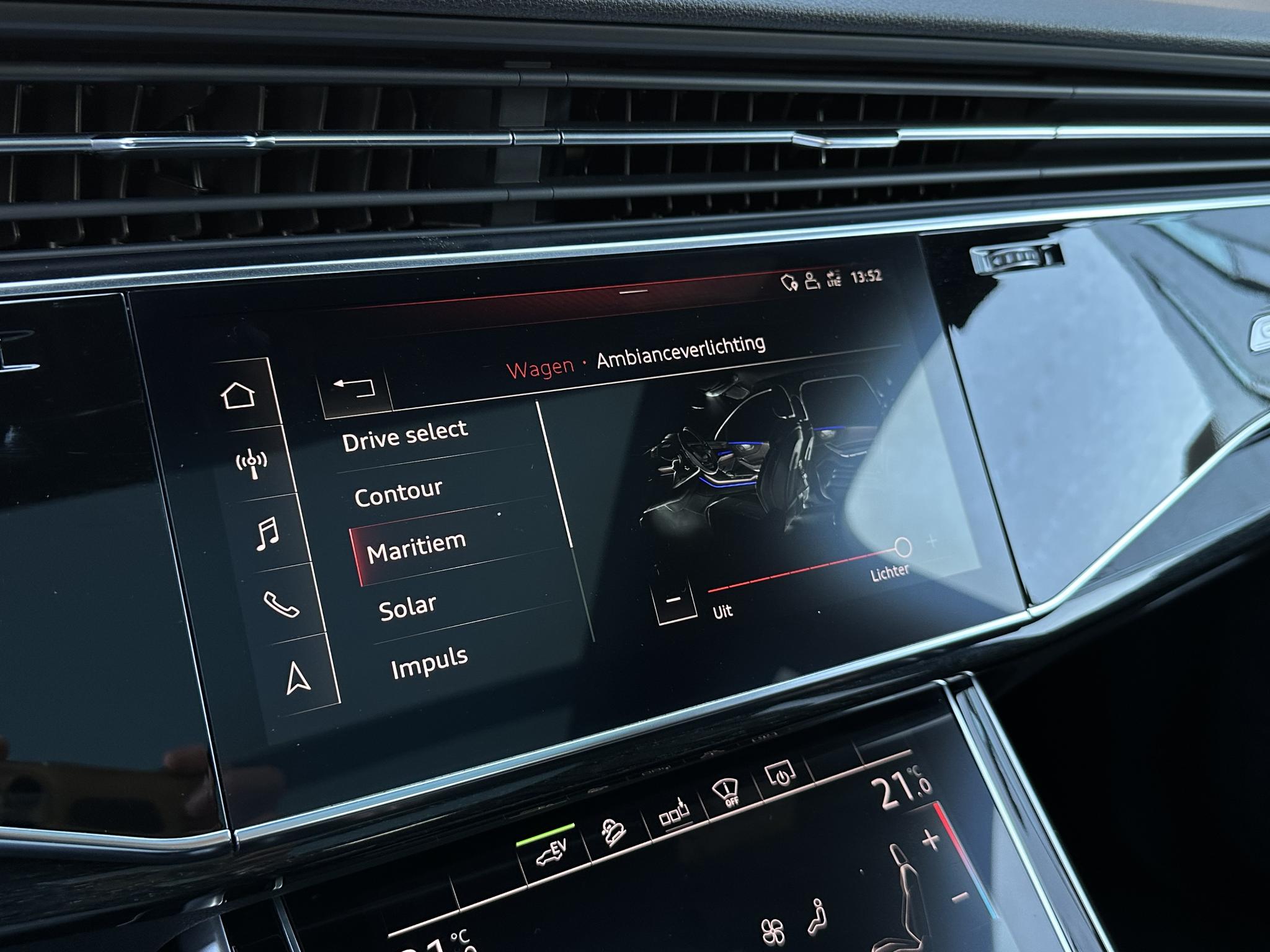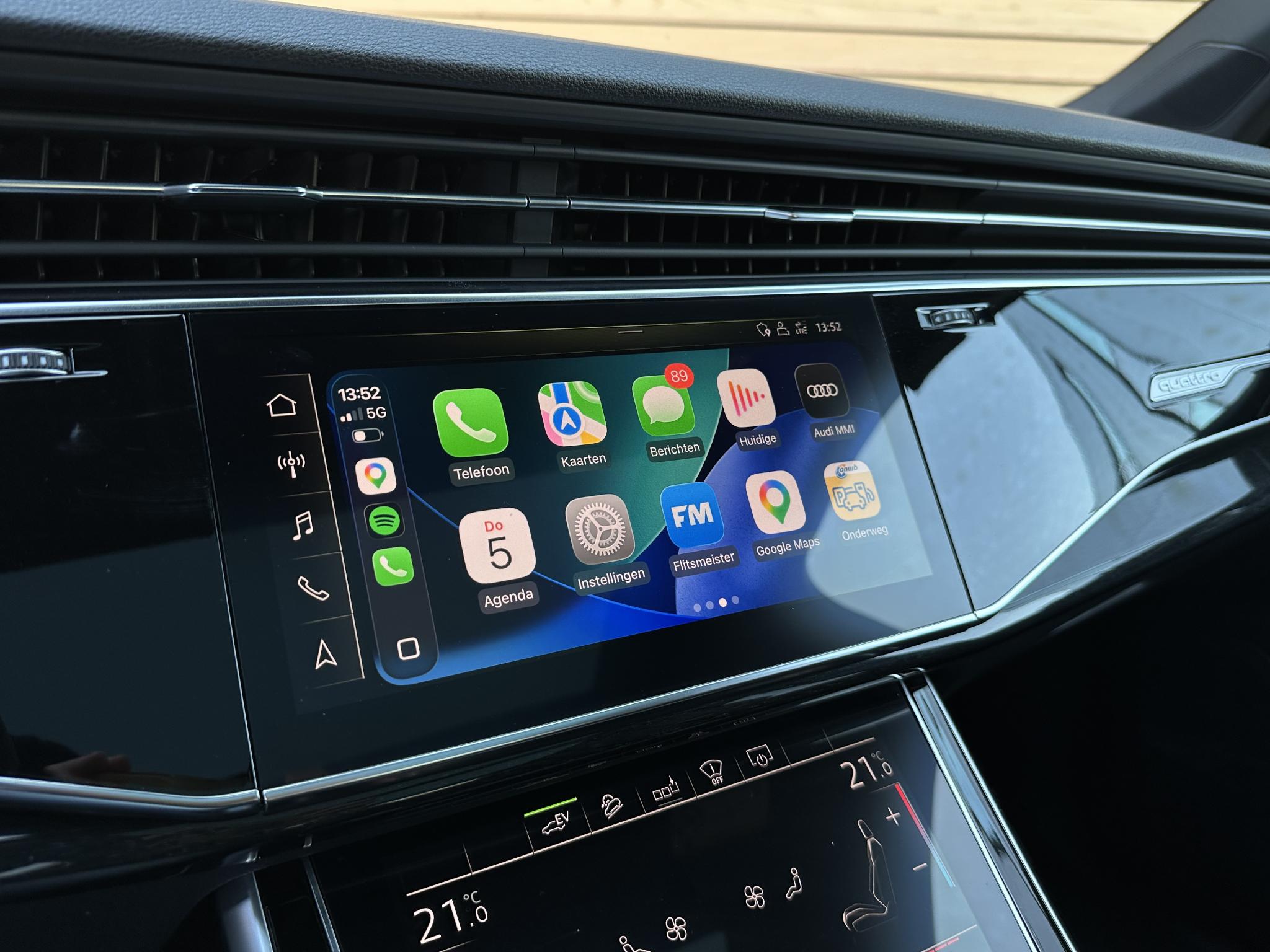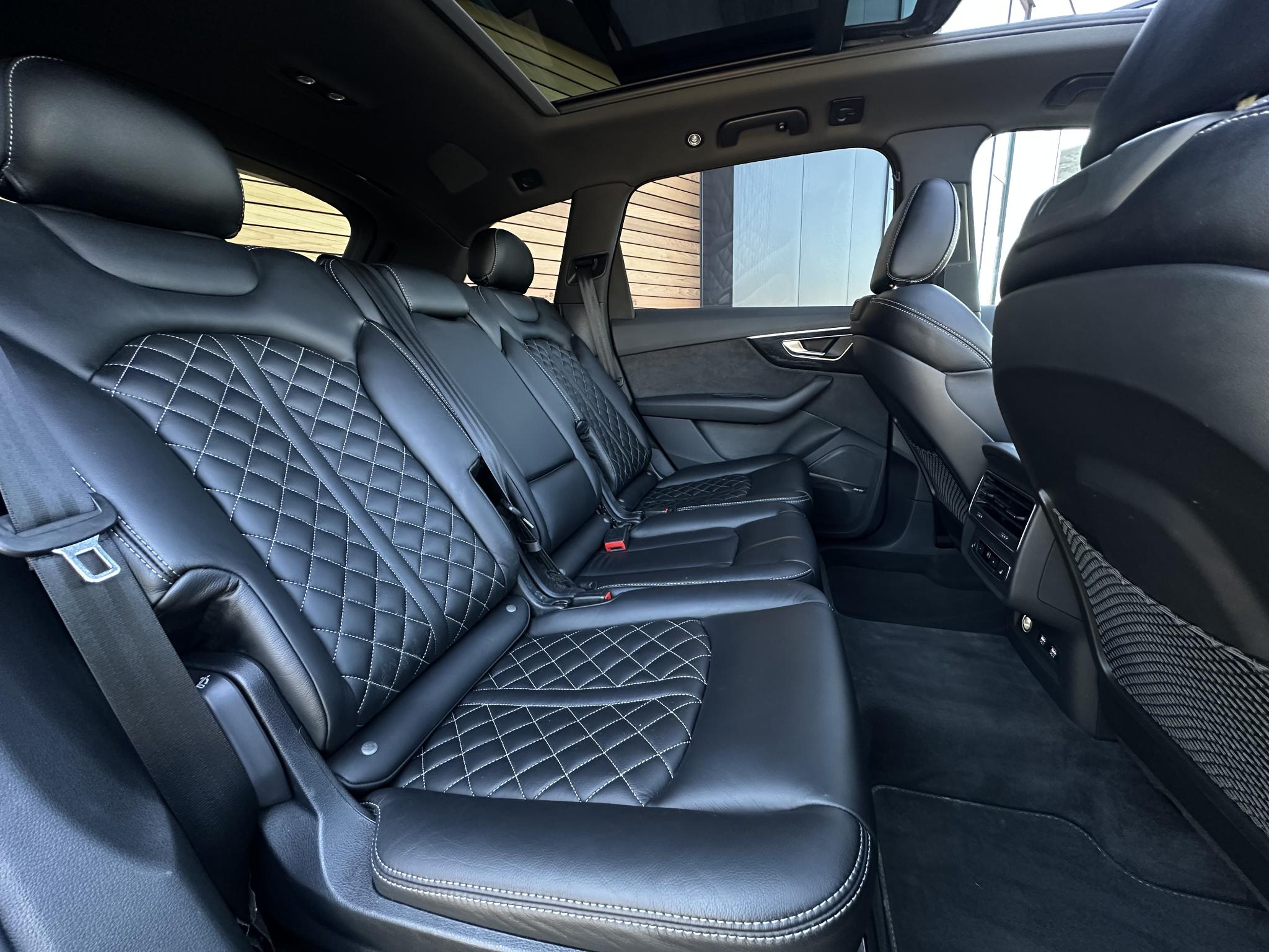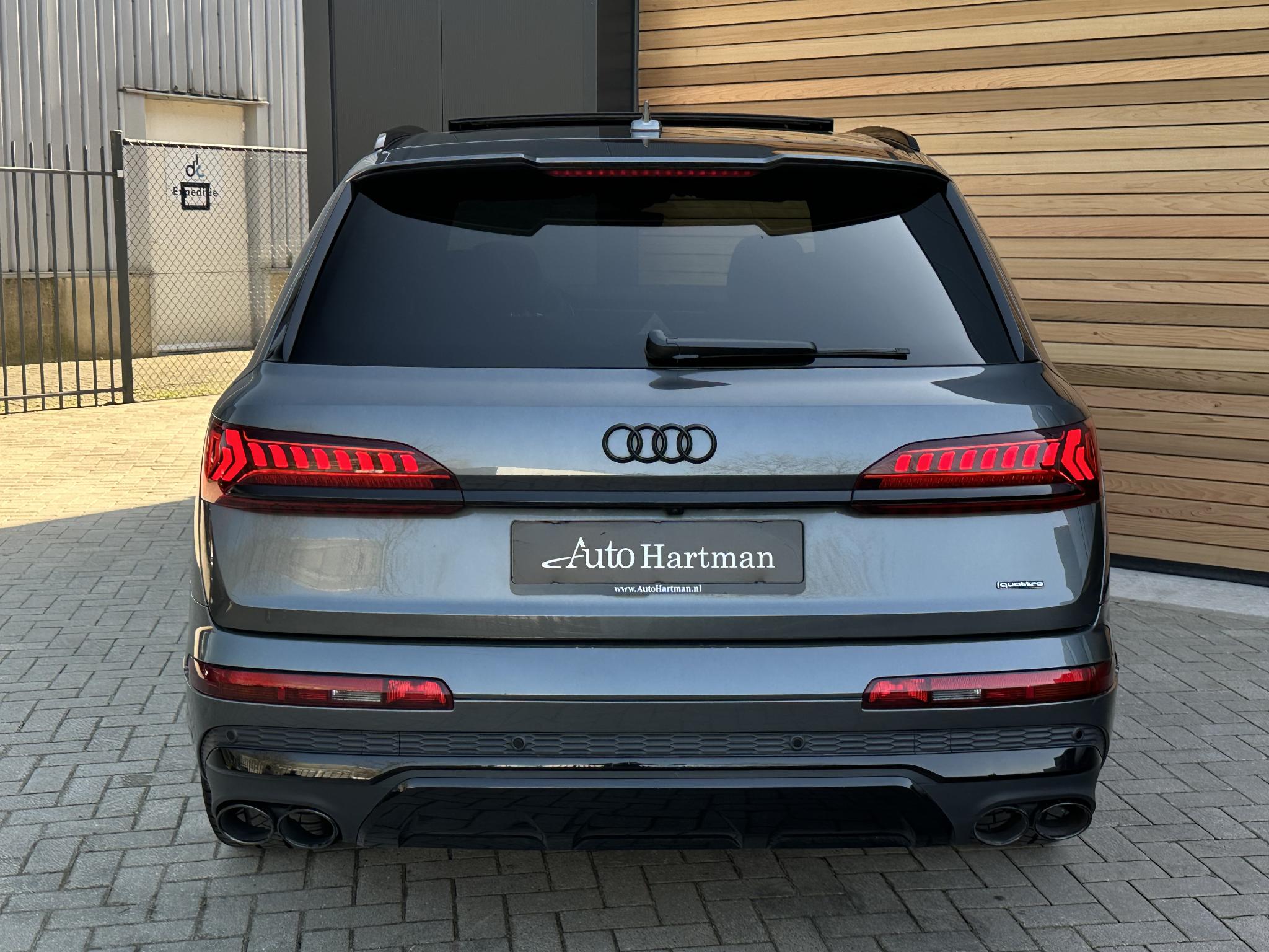 Chassis (adaptive air suspension) 1BK Trekhaak (kogelkop elektrisch zwenkbaar) 1D3 Diefstalbeveiliging voor Wielen (Velgsloten) 1PR Sperdifferentieel 1Y6 Stuurkolom (Stuur) electr. verstelbaar 2C7 Stuur (Sport/leder - 3-spaaks, afgeplat aande onderzijde) met Multifunctie en Schakelfunctie 2PF Panoramadak voor elektrisch, achter vast 3FU Isofix-houder voor Kinderzitje aan Passagiersstoel 3G4 Bevestigingsset voor Railsysteem in Bagageruimte 3GN Stoelen voor electr. verstelbaar (links metMemory) 3L4 Stoelverwarming voor en achter 4A4 Sluit-/startsysteem Advanced Key (Comfortsleutel) Bagage-/laadruimteafdekking elektrisch Laadrandbescherming (Roestvrij staal) Diefstalalarmsysteem +Interieurbeveiliging / Sleepbeveiliging 4I3 Zij-airbag achter 4X4 Achterbank (2. Serie) verschuifbaar (plus) 5KA Hoofdsteunen variabel verstelbaar 5ZC Middenarmsteun voor Comfort-uitrusting 6E6 Buitenspiegel electr. verstelbaar, verwarmbaar en inklapbaar, met Dimautomaat en Memory Buitenspiegel met Stoeprandfunctie, rechts6XL Parelmoereffect-lak 6Y6Y Bandenspanningscontrolesysteem 7K3 Interieurinrichting: Decordelen Hout Eikgrijs 7TM Sound-systeem BOSE 9VS Rear Seat Entertainment RSE (Voorbereiding) 9WQ Bluetooth-handsfree-installatie metS praakherkenning (Audi Phone Box) 9ZE Lichtmetalen velgen 9x20 (5-parallelspaaksdesign) F08 Audi Smartphone Interface IU1 Head-up-display KS1 Hulppakket Tour PCC Hulppakket Stad - Rijassistent-systeem 360 graden rondombescherming (Audi pre sense360°) - Rijassistent-systeem Kruising-assistent - Rijassistent-systeem Uitstap waarschuwing - Rijassistent-systeem Dwarsverkeer assistent Achterkant - Rijassistent-systeem Rijstrookwisselassistent (Side Assist) incl. Audi presense rear PCM Comfort-sleutel met sensorgestuurde Achterklepontgrendeling incl. (openen +sluiten) Laadrandbescherming (Roestvrij staal) Bagage-/laadruimteafdekking elektrisch PGC Matrix-LED-koplamp met Laserverlichting PXB Beglazing achter verduisterd (Privacybeglazing) QL5 Kontur / Ambienteverlichtings-pakket (plus) QQ2 Radio-ontvangst digitaal (DAB) QV3 Audi music interface op de achterbank UF8 Akoestisch glas Portierruiten aan de zijkant VW0 Uitrustingspakket: S line Sport / Plus instaplijsten met Aluminiuminzetstuk en Handtekening, verlicht Laadrandbescherming (Roestvrij staal) Interieurinrichting: Decordelen Aluminium Mat Dakbekleding Stof, zwart Vloermatten Audi exclusive Sportstoelen voor Stoelen voor electr. verstelbaar Lendensteun voor, electr. verstelbaar Schakel-/selectie hefboomgreep Leer (geperforeerd) Stuur (Sport/leder - 3-spaaks) met Multifunctie en Schakelfunctie WQS